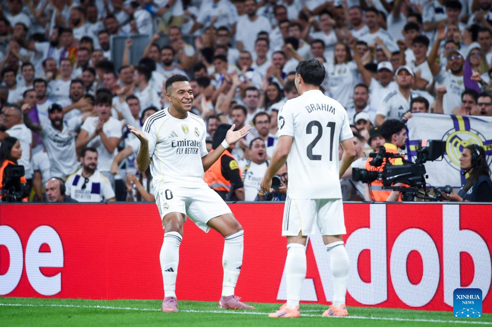 Kylian Mbappe (L) and Brahim Diaz of Real Madrid celebrate a goal during the La Liga football match between Real Madrid and Villarreal CF at the Santiago Bernabeu Stadium, Madrid, Spain, on Oct. 4, 2025. (Photo by Gustavo Valiente/Xinhua)