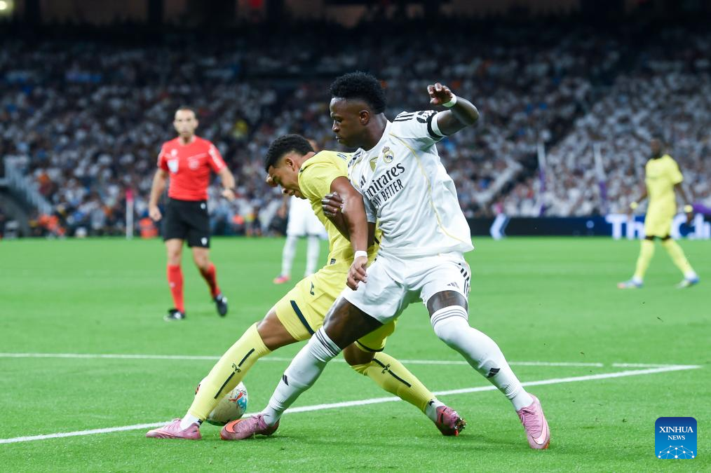 Vinicius Junior (R) of Real Madrid vies with Santiago Mourino of Villarreal CF during the La Liga football match between Real Madrid and Villarreal CF at the Santiago Bernabeu Stadium, Madrid, Spain, on Oct. 4, 2025. (Photo by Gustavo Valiente/Xinhua)