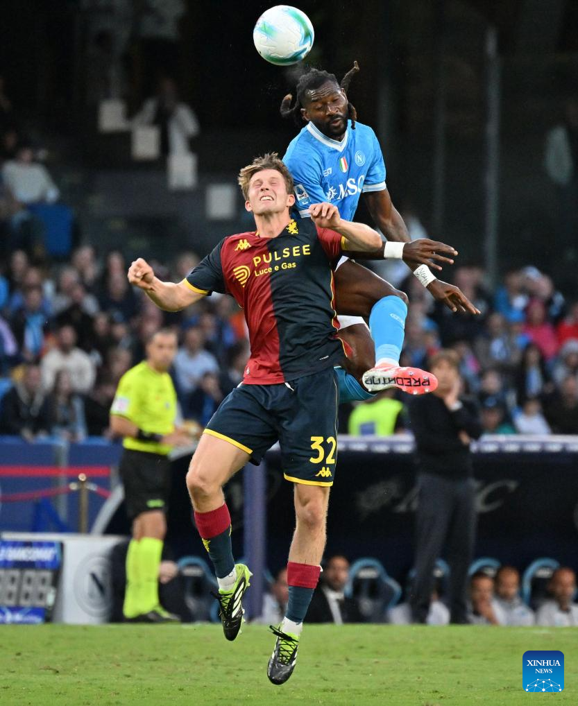 (251006) -- NAPLES, Oct. 6, 2025 (Xinhua) -- Napoli's Frank Anguissa (R) vies with Genoa's Morten Frendrup during a Serie A football match between Napoli and Genoa in Naples, Italy, Oct. 5, 2025. (Xinhua)