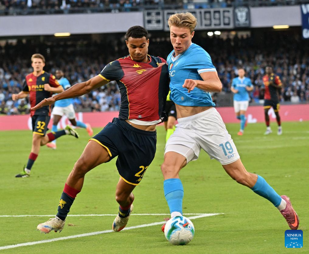 (251006) -- NAPLES, Oct. 6, 2025 (Xinhua) -- Napoli's Rasmus Hojlund (R) vies with Genoa's Alessandro Marcandalli during a Serie A football match between Napoli and Genoa in Naples, Italy, Oct. 5, 2025. (Xinhua)