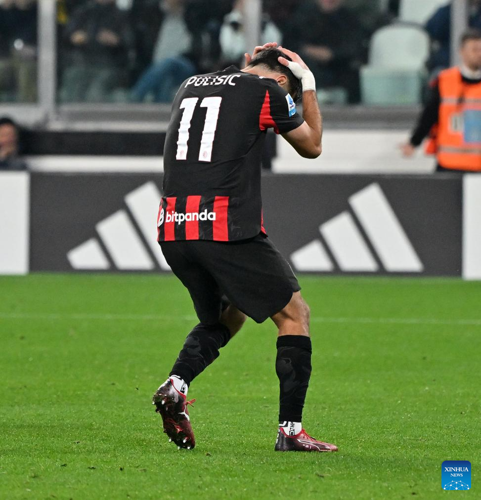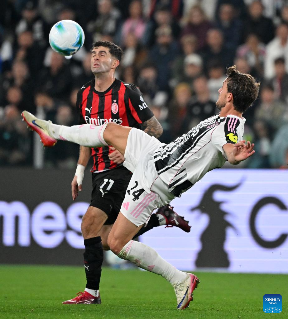 Juventus' Daniele Rugani (R) vies with AC Milan's Christian Pulisic during a Serie A football match between Juventus and AC Milan in Turin, Italy, Oct. 5, 2025. (Photo by Alberto Lingria/Xinhua)