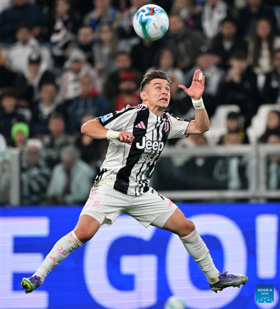 Juventus' Francisco Conceicao heads the ball during a Serie A football match between Juventus and AC Milan in Turin, Italy, Oct. 5, 2025. (Photo by Alberto Lingria/Xinhua)