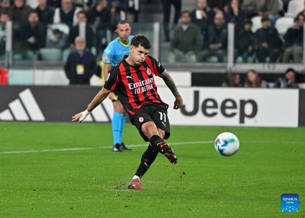 AC Milan's Christian Pulisic fails a penalty kick during a Serie A football match between Juventus and AC Milan in Turin, Italy, Oct. 5, 2025. (Photo by Alberto Lingria/Xinhua)