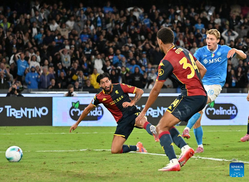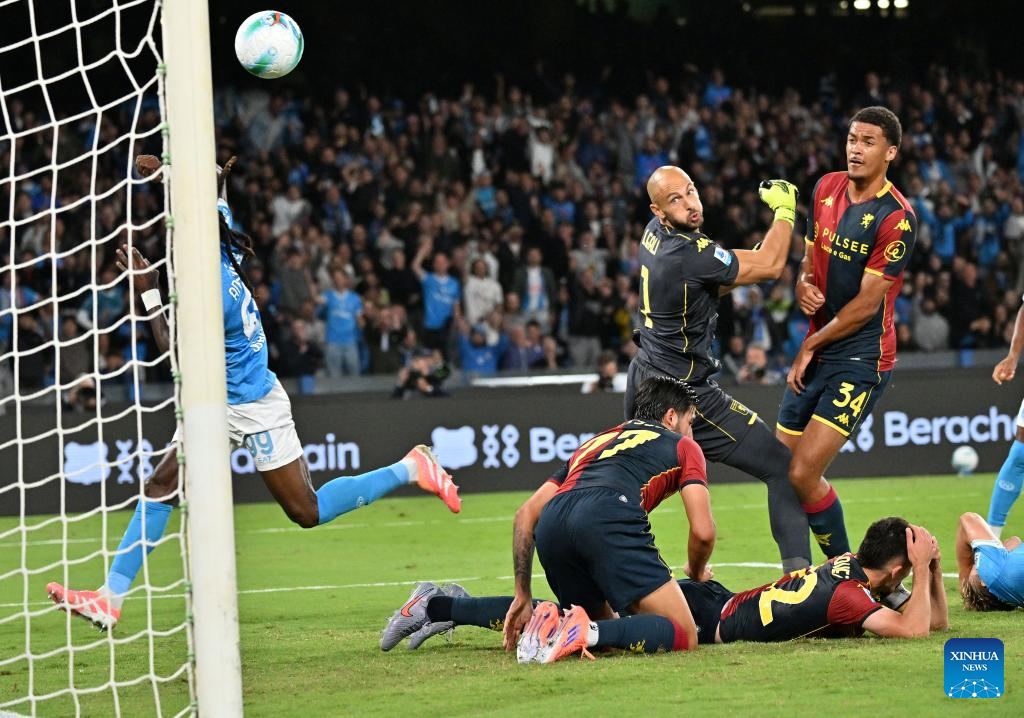 (251006) -- NAPLES, Oct. 6, 2025 (Xinhua) -- Napoli's Frank Anguissa (1st L) scores during a Serie A football match between Napoli and Genoa in Naples, Italy, Oct. 5, 2025. (Xinhua)
