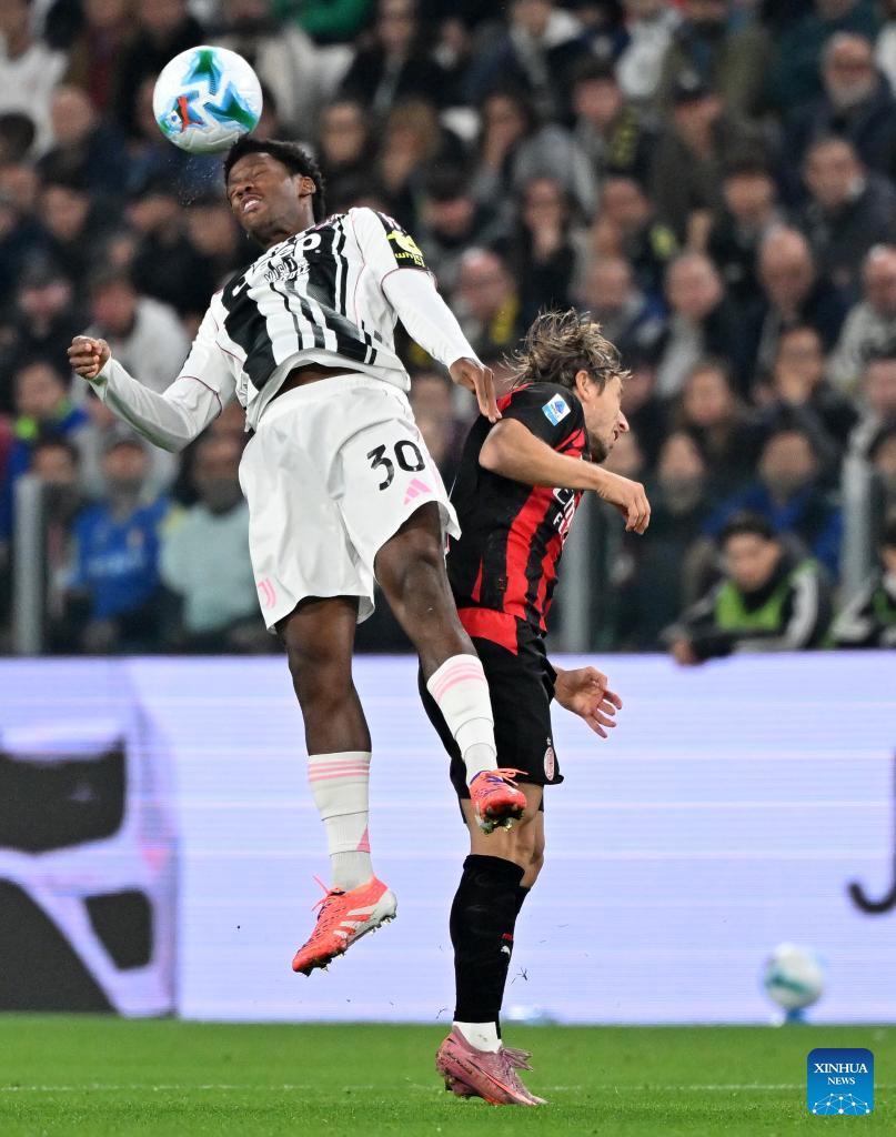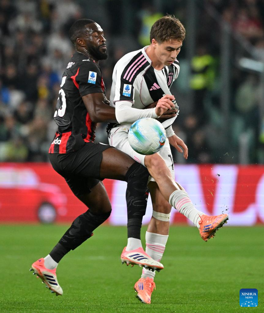 Juventus' Kenan Yildiz (R) vies with AC Milan's Fikayo Tomori during a Serie A football match between Juventus and AC Milan in Turin, Italy, Oct. 5, 2025. (Photo by Alberto Lingria/Xinhua)
