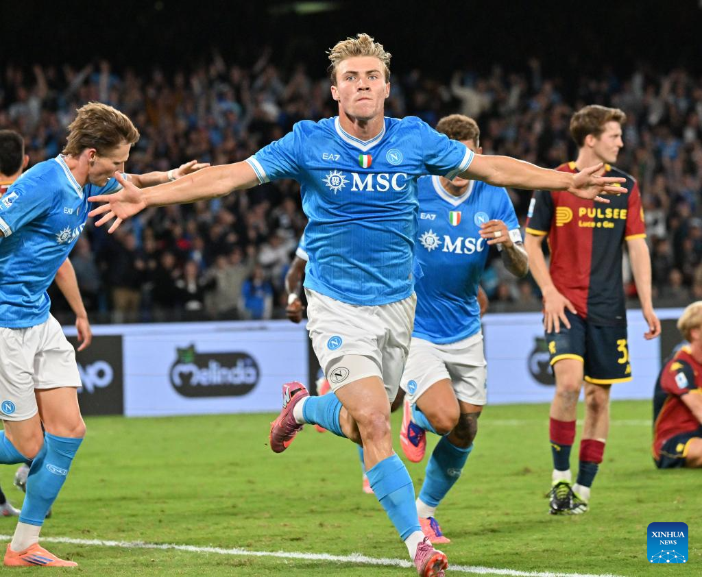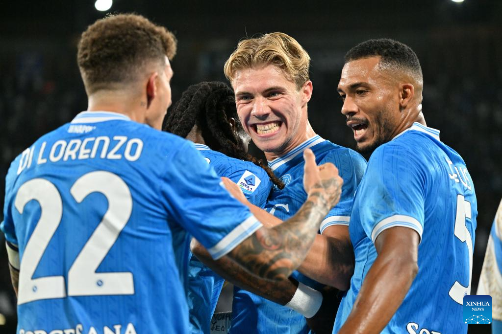 (251006) -- NAPLES, Oct. 6, 2025 (Xinhua) -- Napoli's Rasmus Hojlund (C) celebrates his goal during a Serie A football match between Napoli and Genoa in Naples, Italy, Oct. 5, 2025. (Xinhua)
