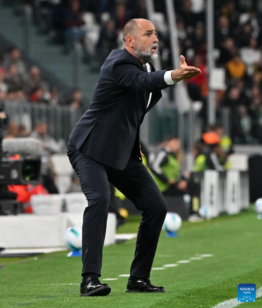 Juventus' head coach Igor Tudor gestures during a Serie A football match between Juventus and AC Milan in Turin, Italy, Oct. 5, 2025. (Photo by Alberto Lingria/Xinhua)