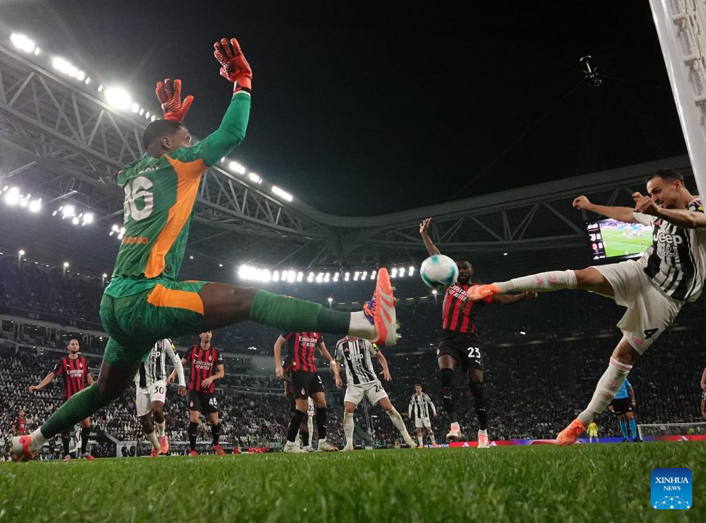 AC Milan's goalkeeper Mike Maignan (L) blocks Juventus' Federico Gatti's attack during a Serie A football match between Juventus and AC Milan in Turin, Italy, Oct. 5, 2025. (Photo by Alberto Lingria/Xinhua)