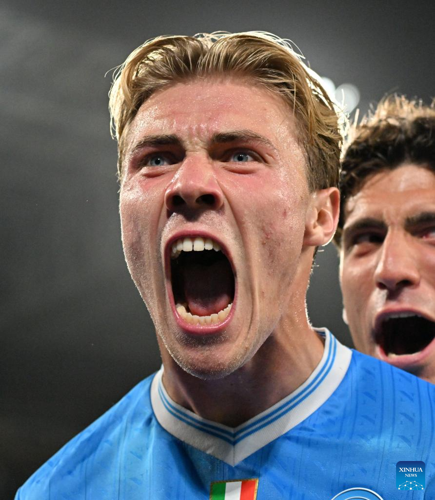 (251006) -- NAPLES, Oct. 6, 2025 (Xinhua) -- Napoli's Rasmus Hojlund celebrates his goal during a Serie A football match between Napoli and Genoa in Naples, Italy, Oct. 5, 2025. (Xinhua)
