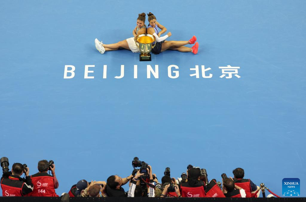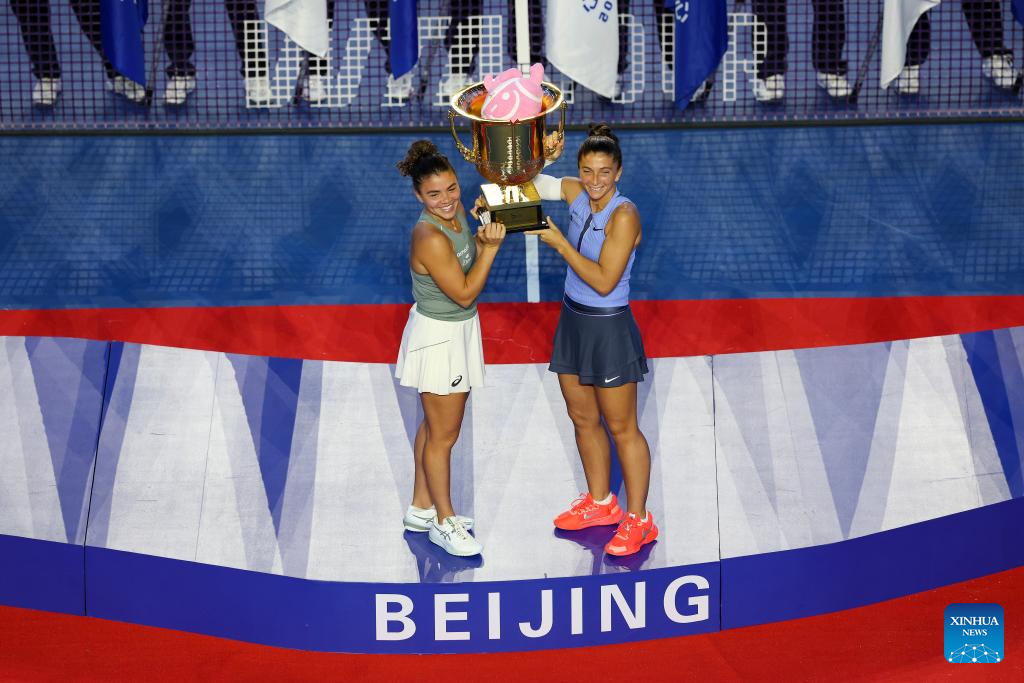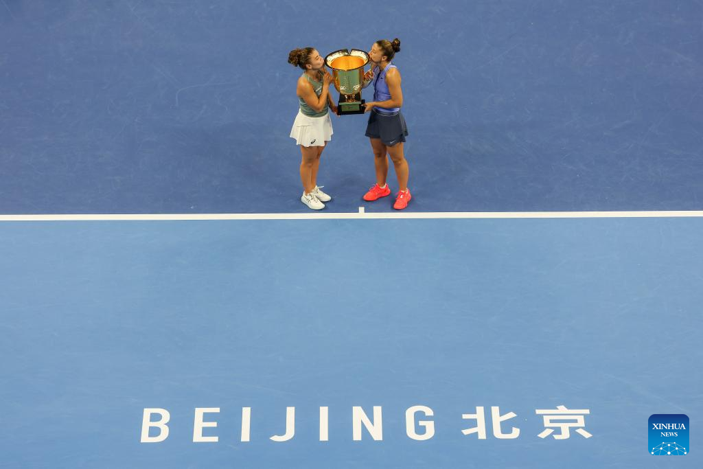 Sara Errani/Jasmine Paolini (L) pose for photos during the awarding ceremony after the women's doubles final between Kato Miyu (Japan)/Fanny Stollar (Hungary) and Sara Errani/Jasmine Paolini of Italy at 2025 China Open tennis tournament in Beijing, China, Oct. 5, 2025. (Xinhua/Bai xuefei)