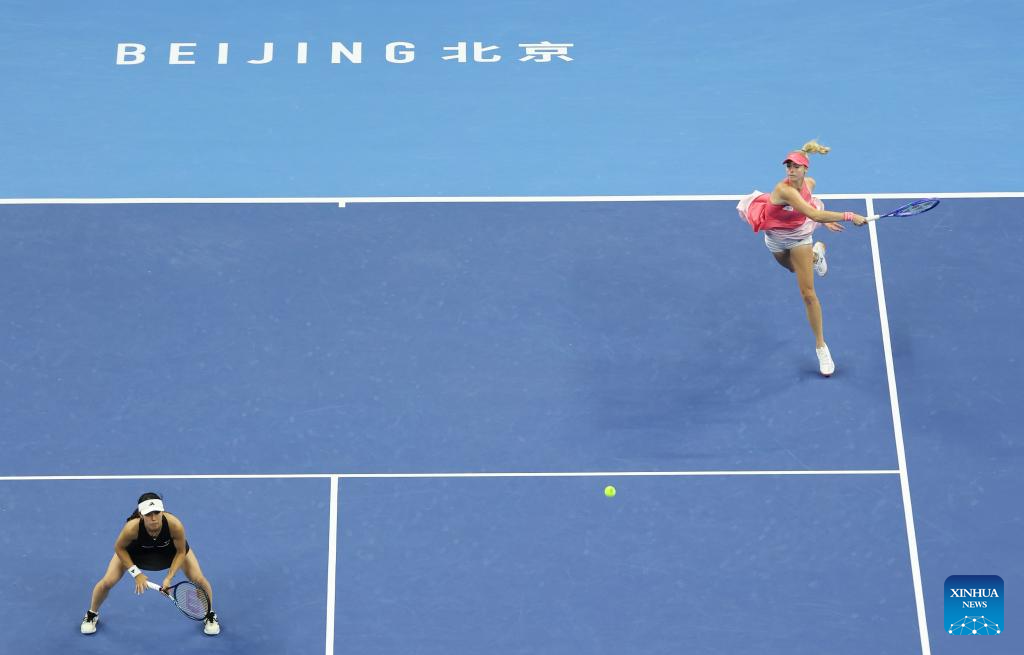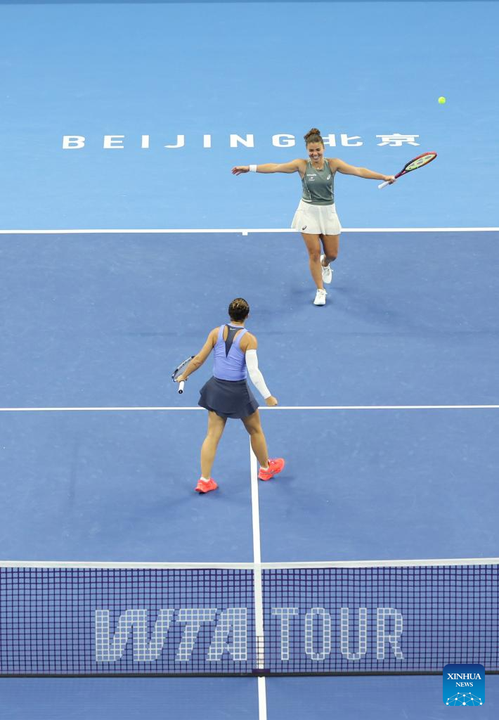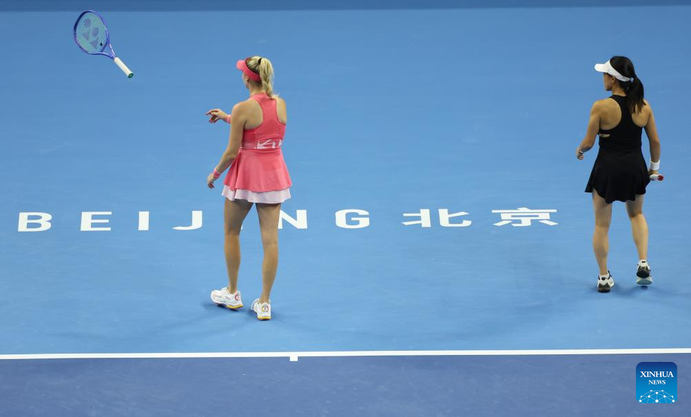 Kato Miyu/Fanny Stollar (top) compete during the women's doubles final between Kato Miyu (Japan)/Fanny Stollar (Hungary) and Sara Errani/Jasmine Paolini of Italy at 2025 China Open tennis tournament in Beijing, China, Oct. 5, 2025. (Xinhua/Bai xuefei)
