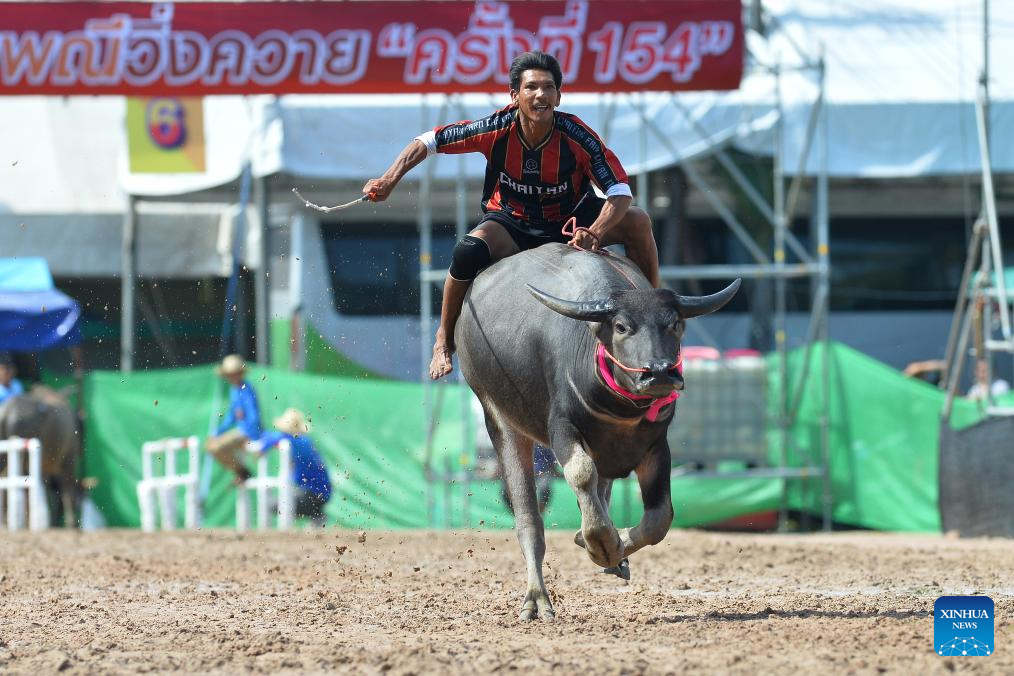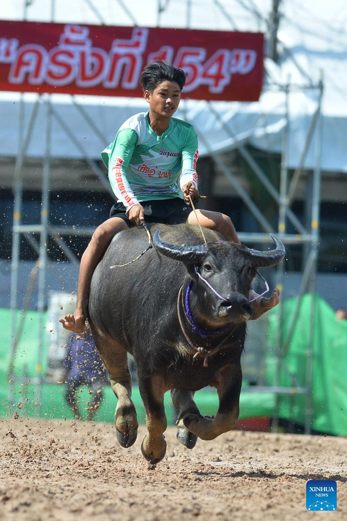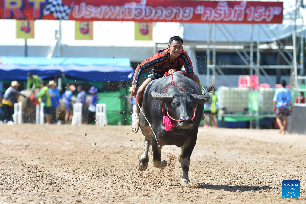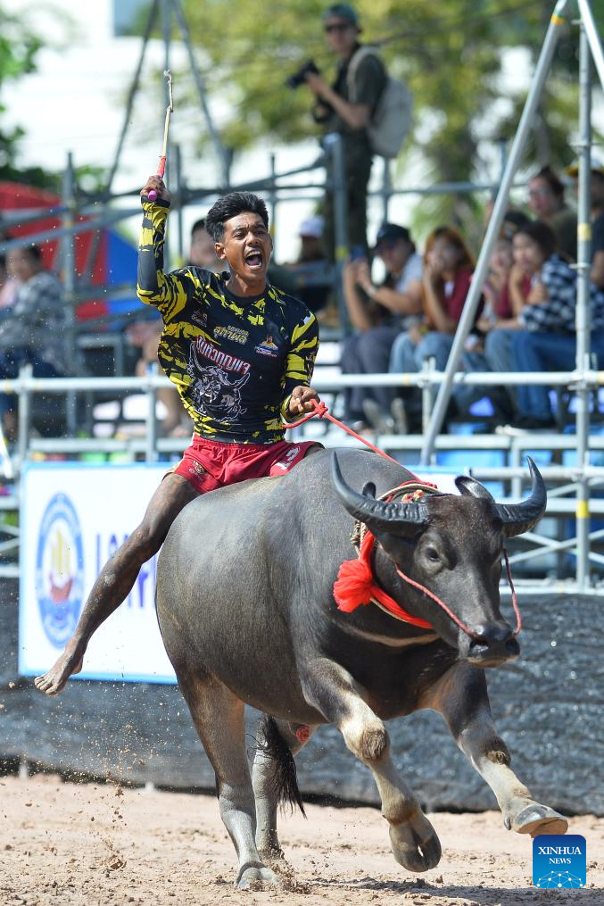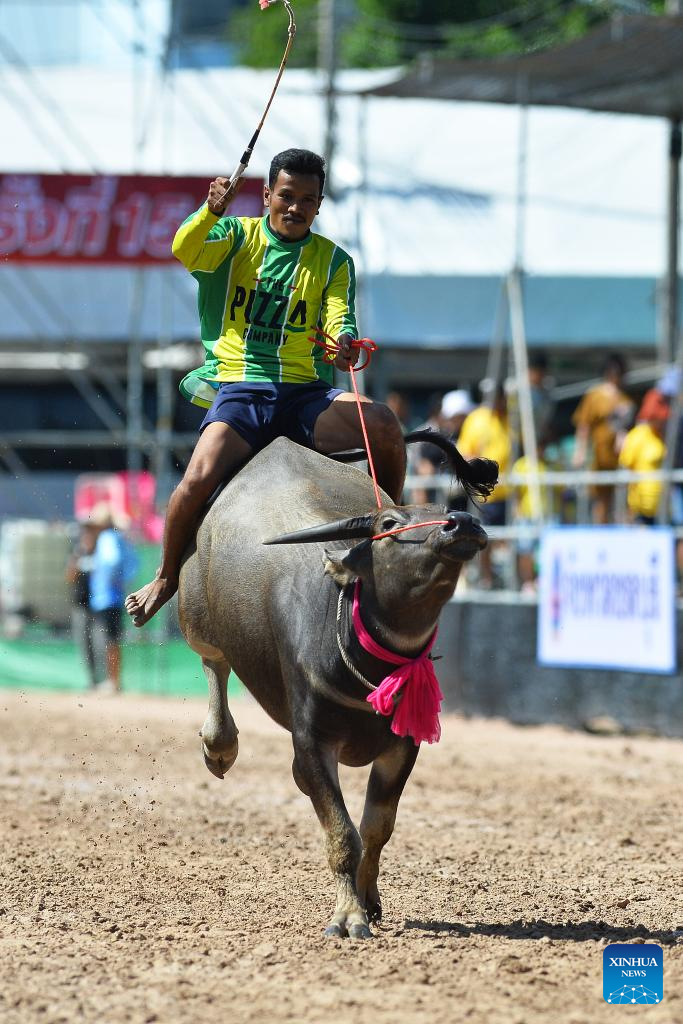 A racer competes during a buffalo racing in Chonburi, Thailand, Oct. 6, 2025. Hundreds of buffaloes took part in the buffalo racing festival held annually in October among rice farmers to celebrate the rice harvest. (Photo by Rachen Sageamsak/Xinhua)