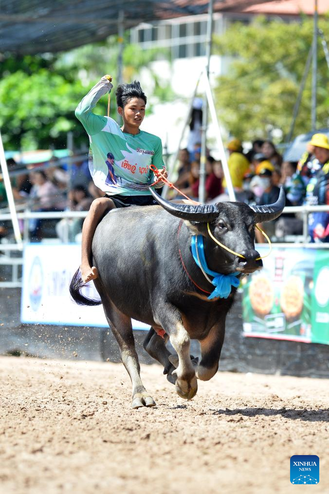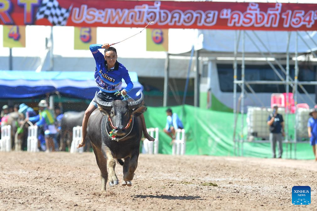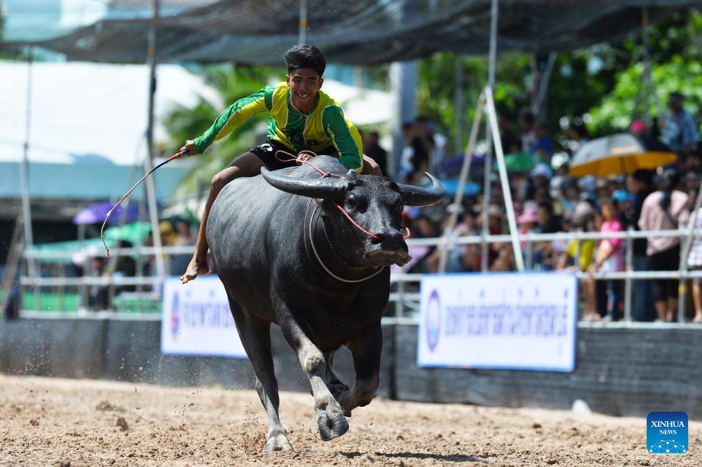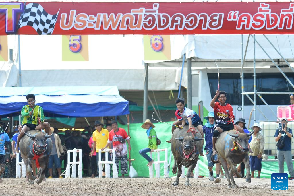 Racers compete during a buffalo racing in Chonburi, Thailand, Oct. 6, 2025. Hundreds of buffaloes took part in the buffalo racing festival held annually in October among rice farmers to celebrate the rice harvest. (Photo by Rachen Sageamsak/Xinhua)