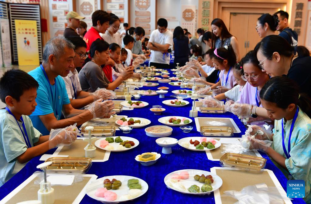 Children and their parents make moon cakes in Jiangyin, east China's Jiangsu Province, Oct. 6, 2025. People participated in diverse traditional folk cultural events on Monday to celebrate the traditional Mid-Autumn Festival. (Photo by Huan Yueliang/Xinhua)