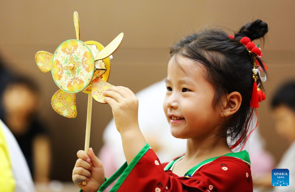A child makes a toy windmill at a museum in Tengzhou, east China's Shandong Province, Oct. 6, 2025. People participated in diverse traditional folk cultural events on Monday to celebrate the traditional Mid-Autumn Festival. (Photo by Li Zhijun/Xinhua)