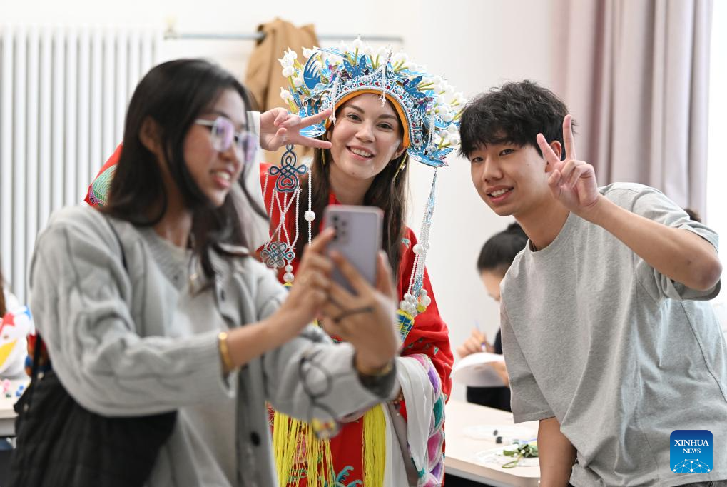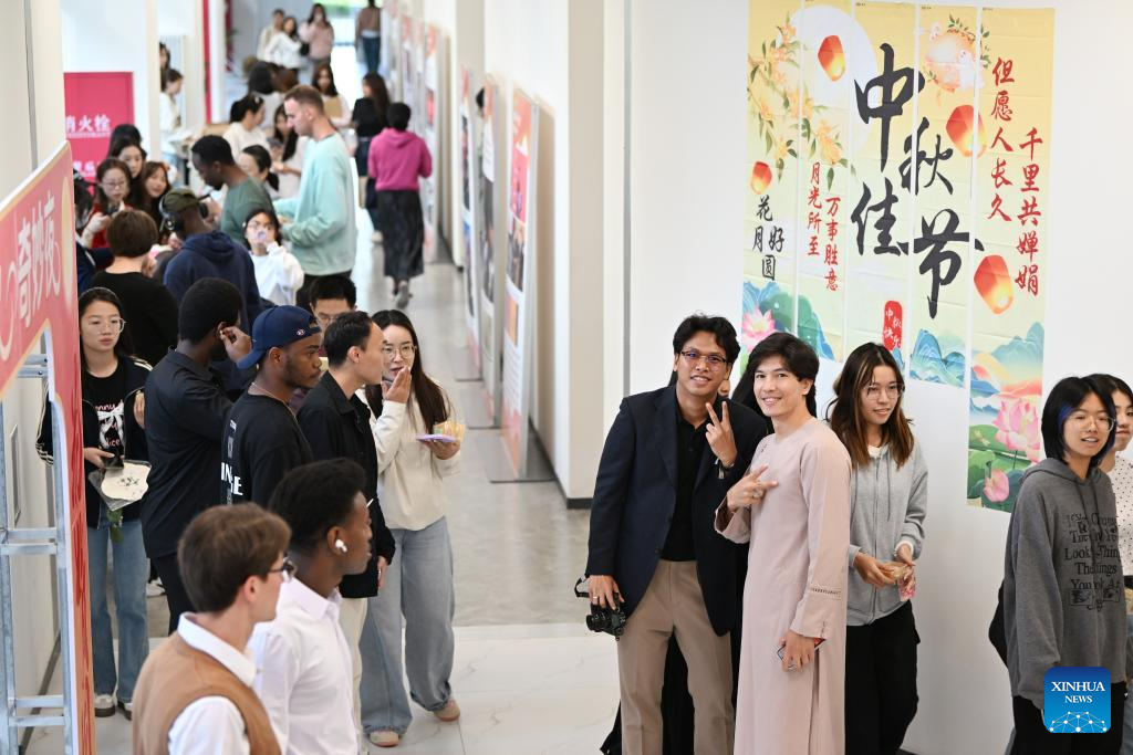 Chinese and international students participate in an event marking the Mid-Autumn Festival at Tianjin Normal University in north China's Tianjin, Oct. 6, 2025. People participated in diverse traditional folk cultural events on Monday to celebrate the Mid-Autumn Festival. (Xinhua/Li Ran)