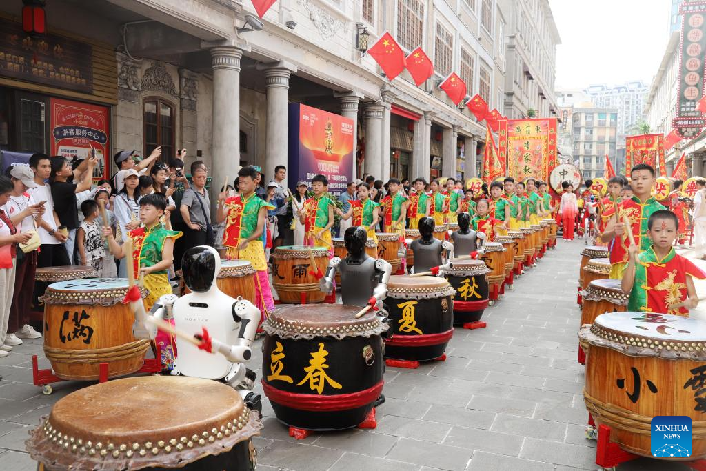 Performers and robots play drums at a scenic spot in Shantou, south China's Guangdong Province, Oct. 6, 2025. People participated in diverse traditional folk cultural events on Monday to celebrate the Mid-Autumn Festival. (Photo by Yao Jun/Xinhua)