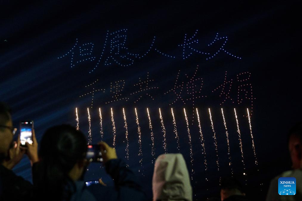 People take photos of a drone light show in Harbin, northeast China's Heilongjiang Province, Oct. 6, 2025. People participated in diverse traditional folk cultural events on Monday to celebrate the Mid-Autumn Festival. (Xinhua/Zhang Tao)