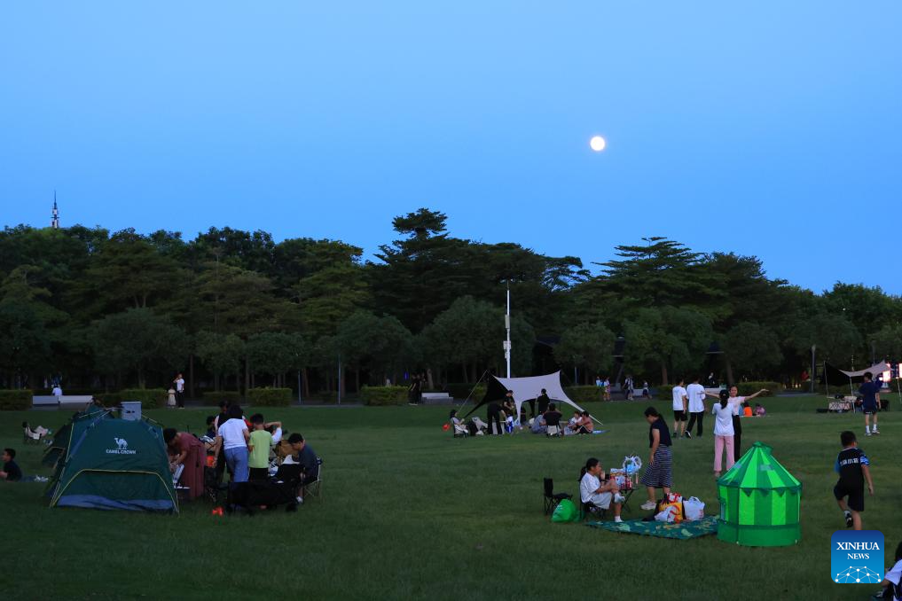 People admire the full moon at a campsite in Shenzhen, south China's Guangdong Province, Oct. 6, 2025. People participated in diverse traditional folk cultural events on Monday to celebrate the Mid-Autumn Festival. (Xinhua/Mao Siqian)