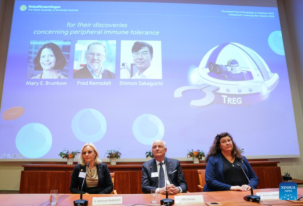 STOCKHOLM, Oct. 6 (Xinhua) -- Mary E. Brunkow, Fred Ramsdell, and Shimon Sakaguchi were awarded the 2025 Nobel Prize in Physiology or Medicine on Monday for their discoveries concerning peripheral immune tolerance, the Nobel Assembly at Sweden's Karolinska Institute announced.