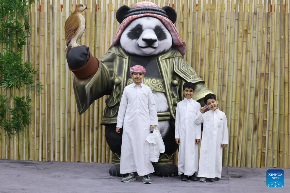 Children pose for a photo in front of a sculpture at the entrance of the Chinese pavilion during the Saudi International Falcons and Hunting Exhibition 2025 in Riyadh, Saudi Arabia, Oct. 6, 2025. The Saudi International Falcons and Hunting Exhibition 2025 opened in Riyadh on Oct. 2, with more than 1,300 exhibitors and brands from 45 countries showcasing their latest innovations. The exhibition will run until Oct. 11.