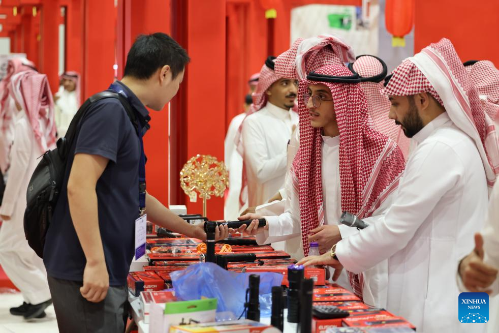 Visitors buy outdoor equipment at the Chinese pavilion during the Saudi International Falcons and Hunting Exhibition 2025 in Riyadh, Saudi Arabia, Oct. 6, 2025. The Saudi International Falcons and Hunting Exhibition 2025 opened in Riyadh on Oct. 2, with more than 1,300 exhibitors and brands from 45 countries showcasing their latest innovations. The exhibition will run until Oct. 11.