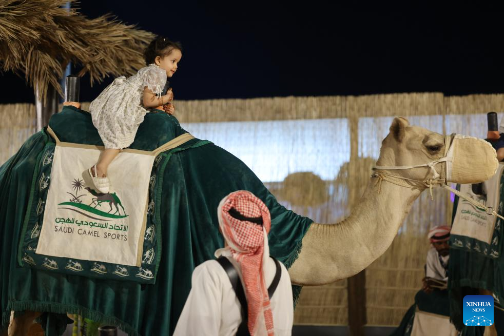 A girl experiences riding a camel at an outdoor exhibition area during the Saudi International Falcons and Hunting Exhibition 2025 in Riyadh, Saudi Arabia, Oct. 6, 2025. The Saudi International Falcons and Hunting Exhibition 2025 opened in Riyadh on Oct. 2, with more than 1,300 exhibitors and brands from 45 countries showcasing their latest innovations. The exhibition will run until Oct. 11.