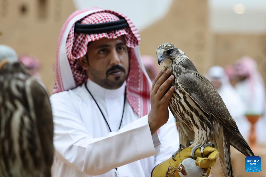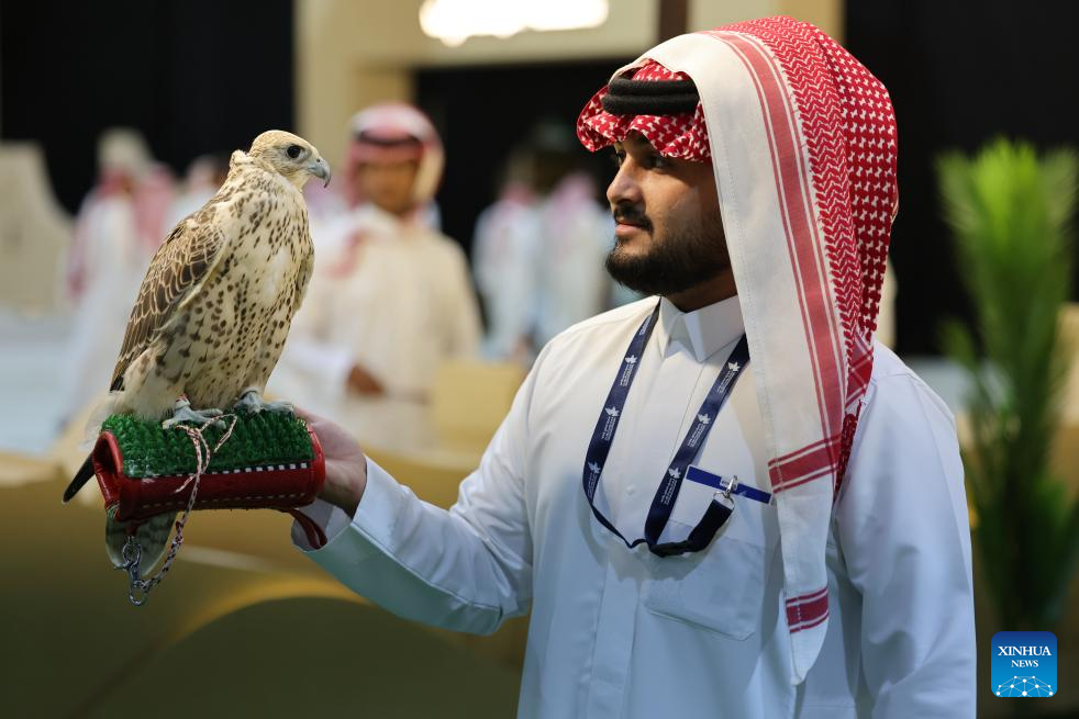 An exhibitor shows a falcon to visitors during the Saudi International Falcons and Hunting Exhibition 2025 in Riyadh, Saudi Arabia, Oct. 6, 2025. The Saudi International Falcons and Hunting Exhibition 2025 opened in Riyadh on Oct. 2, with more than 1,300 exhibitors and brands from 45 countries showcasing their latest innovations. The exhibition will run until Oct. 11.