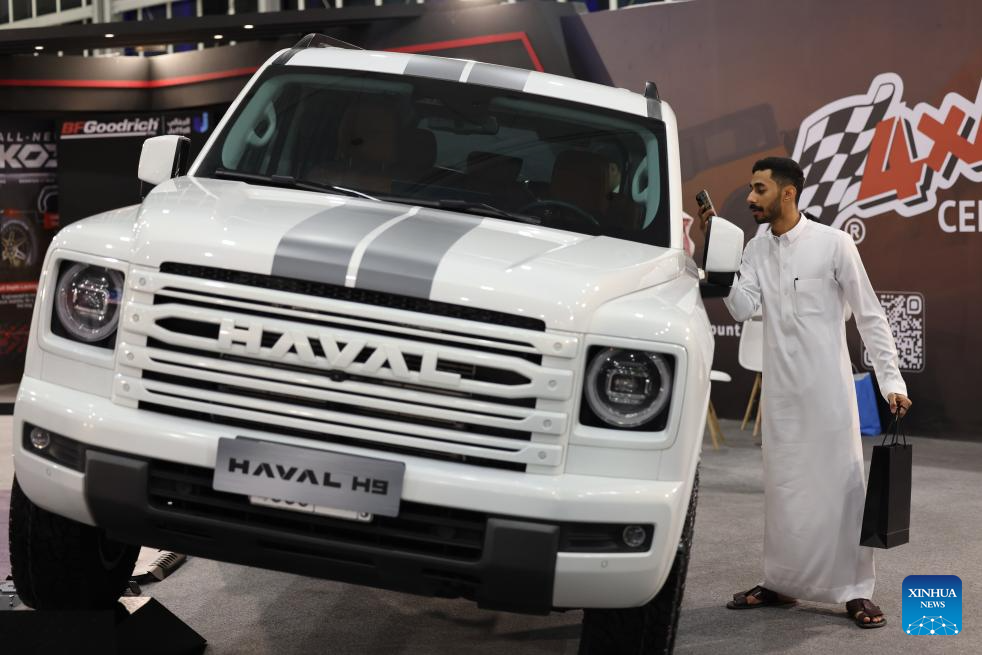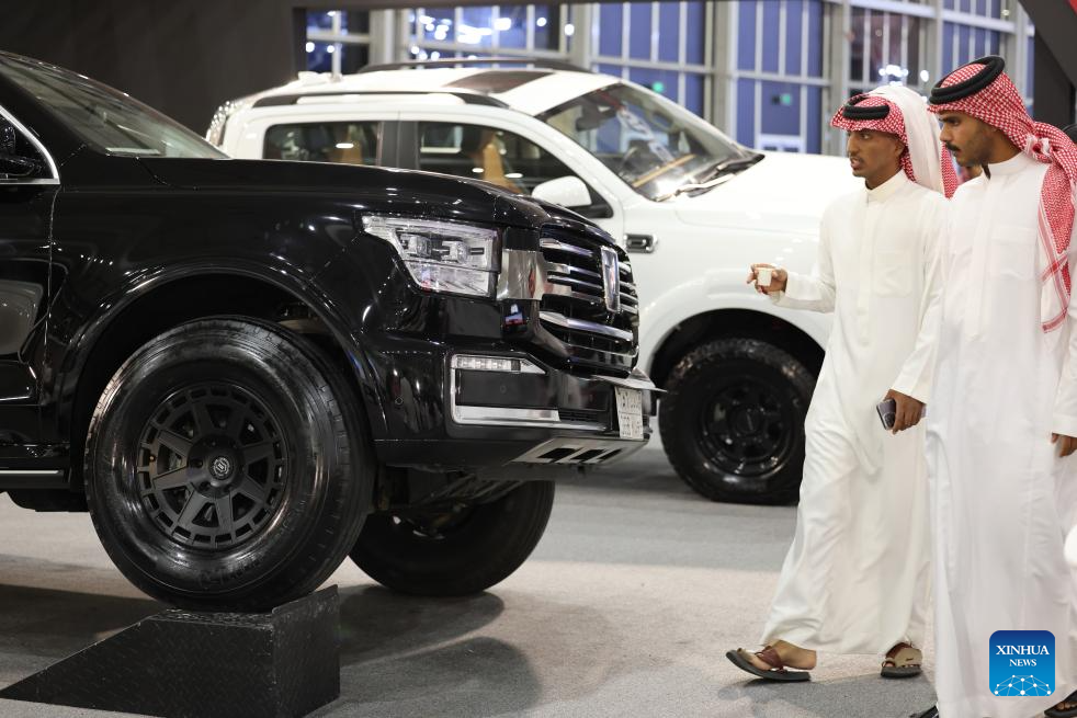 Visitors look at Chinese brand off-road vehicles during the Saudi International Falcons and Hunting Exhibition 2025 in Riyadh, Saudi Arabia, Oct. 6, 2025. The Saudi International Falcons and Hunting Exhibition 2025 opened in Riyadh on Oct. 2, with more than 1,300 exhibitors and brands from 45 countries showcasing their latest innovations. The exhibition will run until Oct. 11.