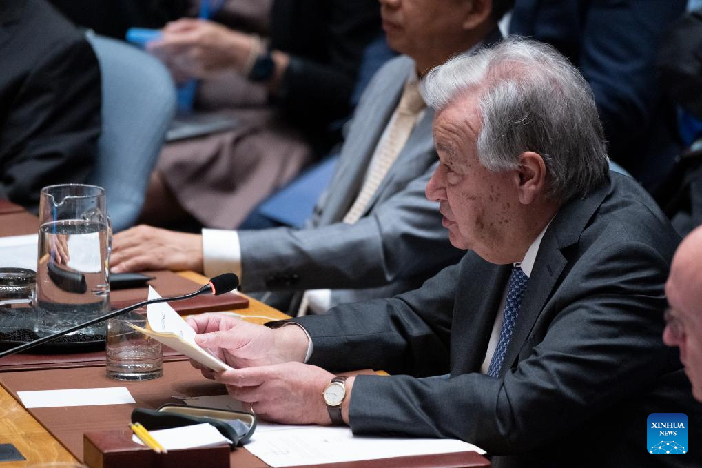UN Secretary-General Antonio Guterres speaks at a Security Council meeting at the UN headquarters in New York, Oct. 6, 2025. Guterres on Monday regretted the lack of progress in the women, peace and security agenda. (Evan Schneider/UN Photo/Handout via Xinhua)