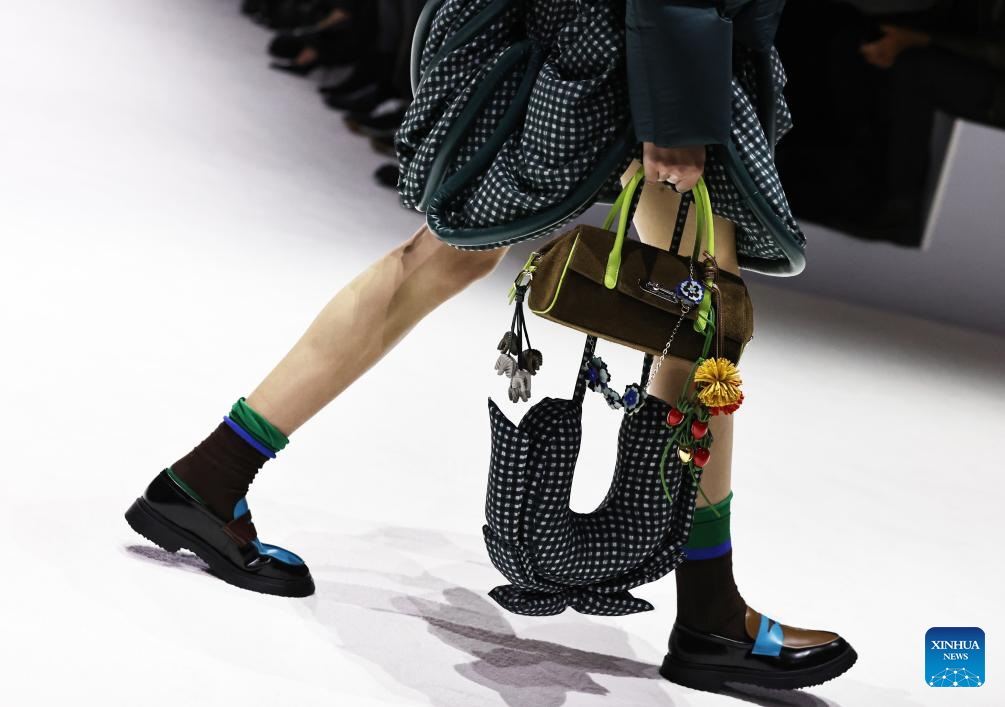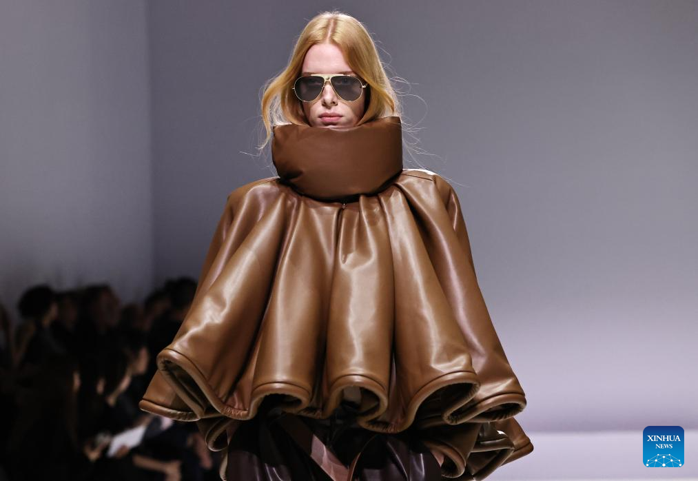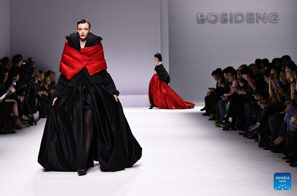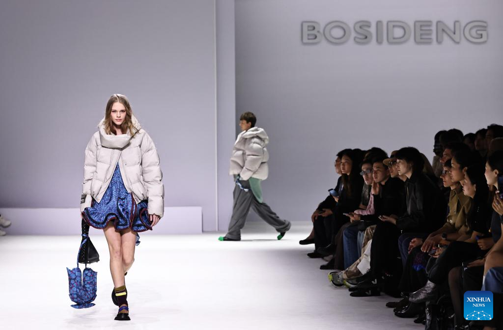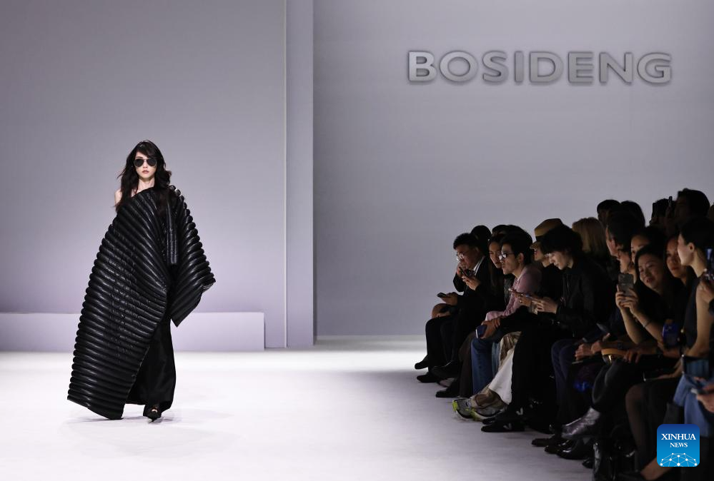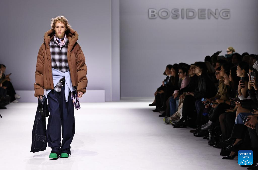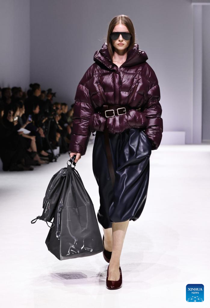 A model presents a creation by Chinese down fashion brand Bosideng as part of its Master Puff collection during the Paris Fashion Week in Paris, France, on Oct. 7, 2025. (Xinhua/Gao Jing)