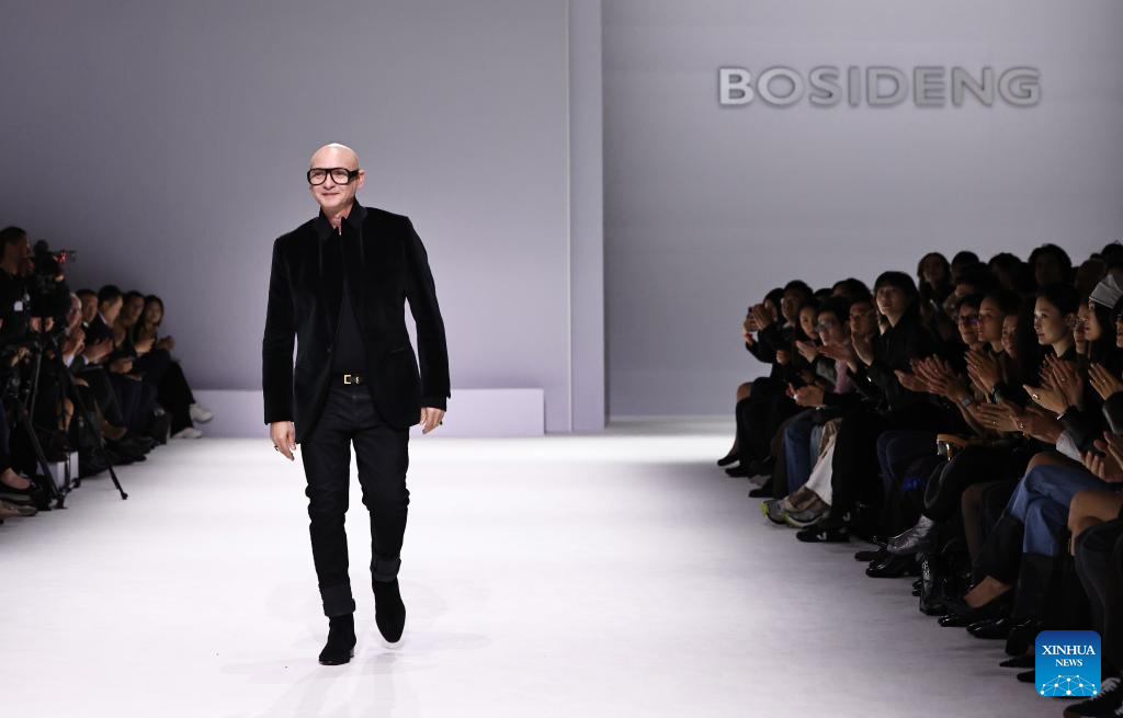 Bosideng Creative Director Pietro Ferragina salutes the audience at the end of the fashion show of the Chinese down fashion brand Bosideng as part of its Master Puff collection during the Paris Fashion Week, in Paris, France, on Oct. 7, 2025. (Xinhua/Gao Jing)