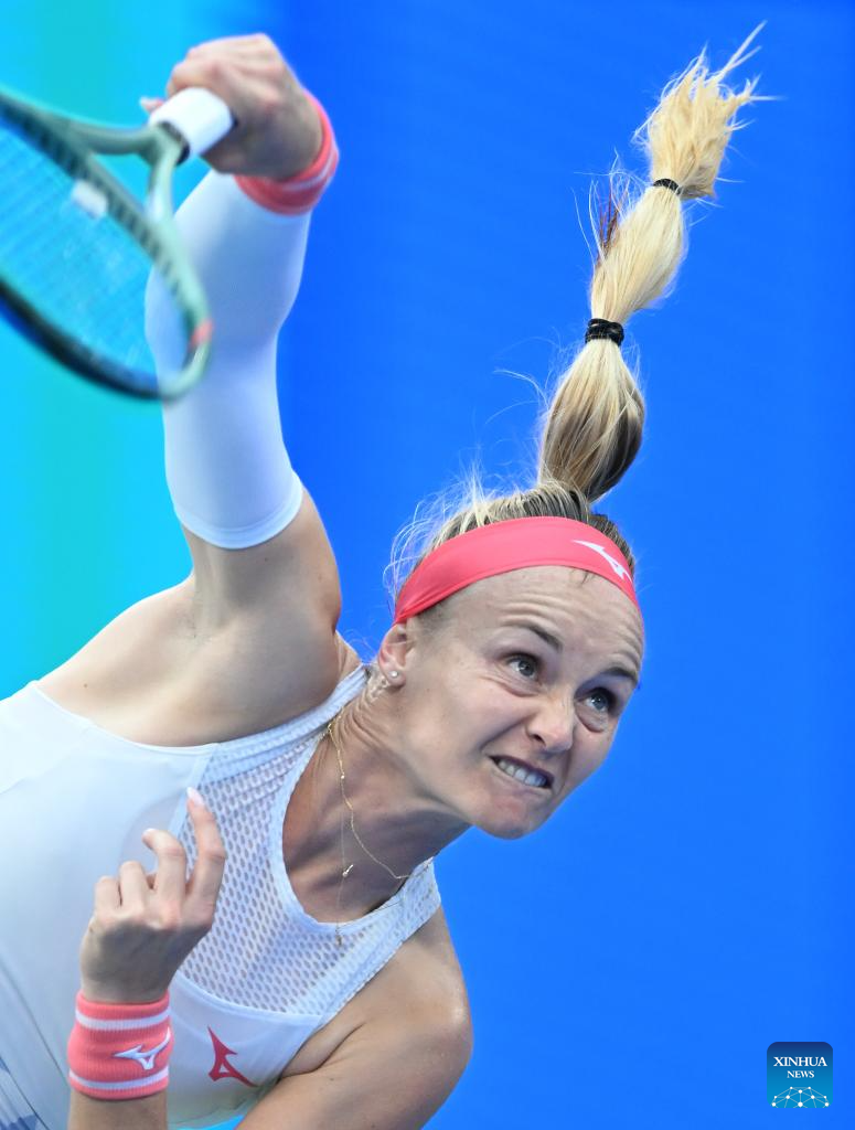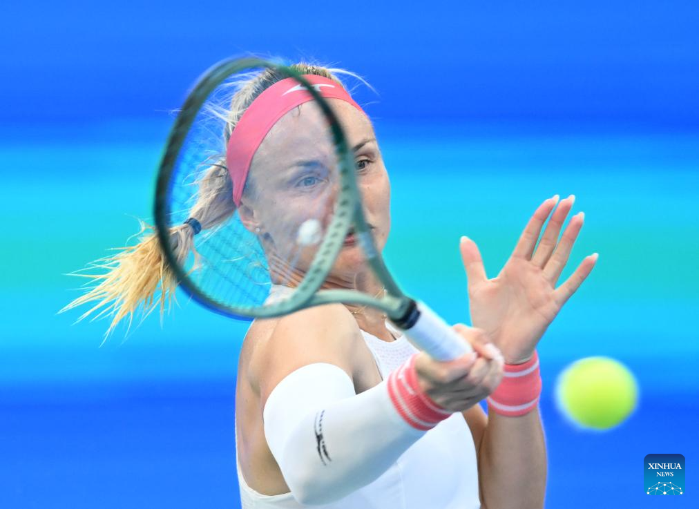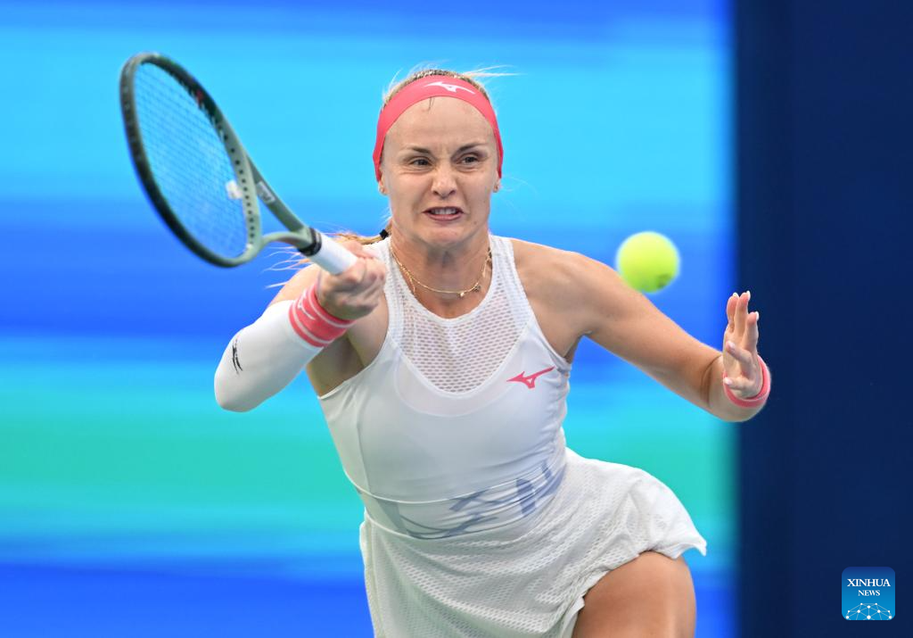 Rebecca Sramkova of Slovakia hits a return during the women's singles round of 32 match against Aryna Sabalenka of Belarus at the 2025 Wuhan Open tennis tournament in Wuhan, central China's Hubei Province, Oct. 8, 2025. (Xinhua/Cheng Min)