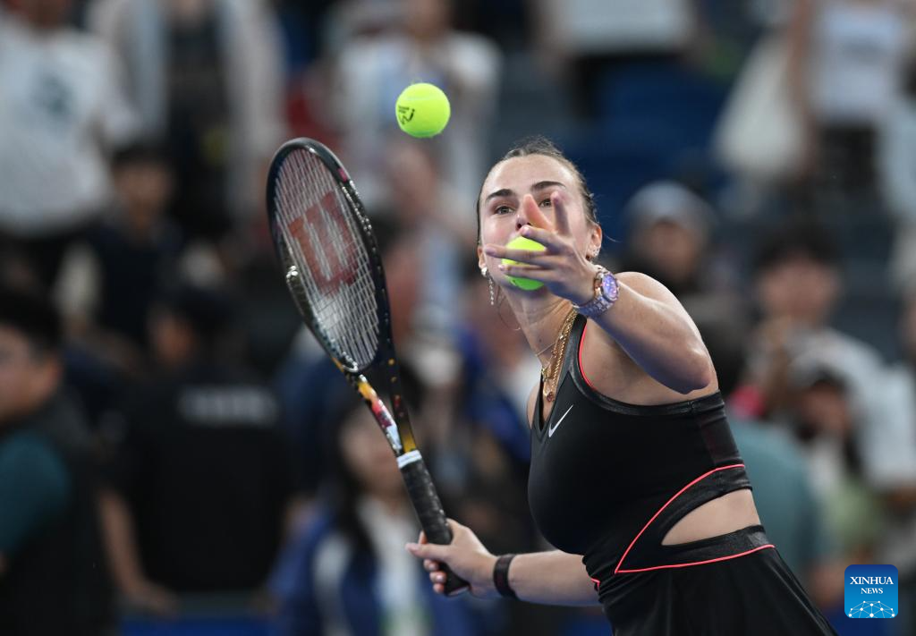 Aryna Sabalenka of Belarus enters the court before the women's singles round of 32 match against Rebecca Sramkova of Slovakia at the 2025 Wuhan Open tennis tournament in Wuhan, central China's Hubei Province, Oct. 8, 2025. (Xinhua/Cheng Min)