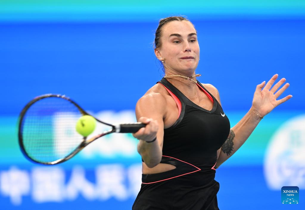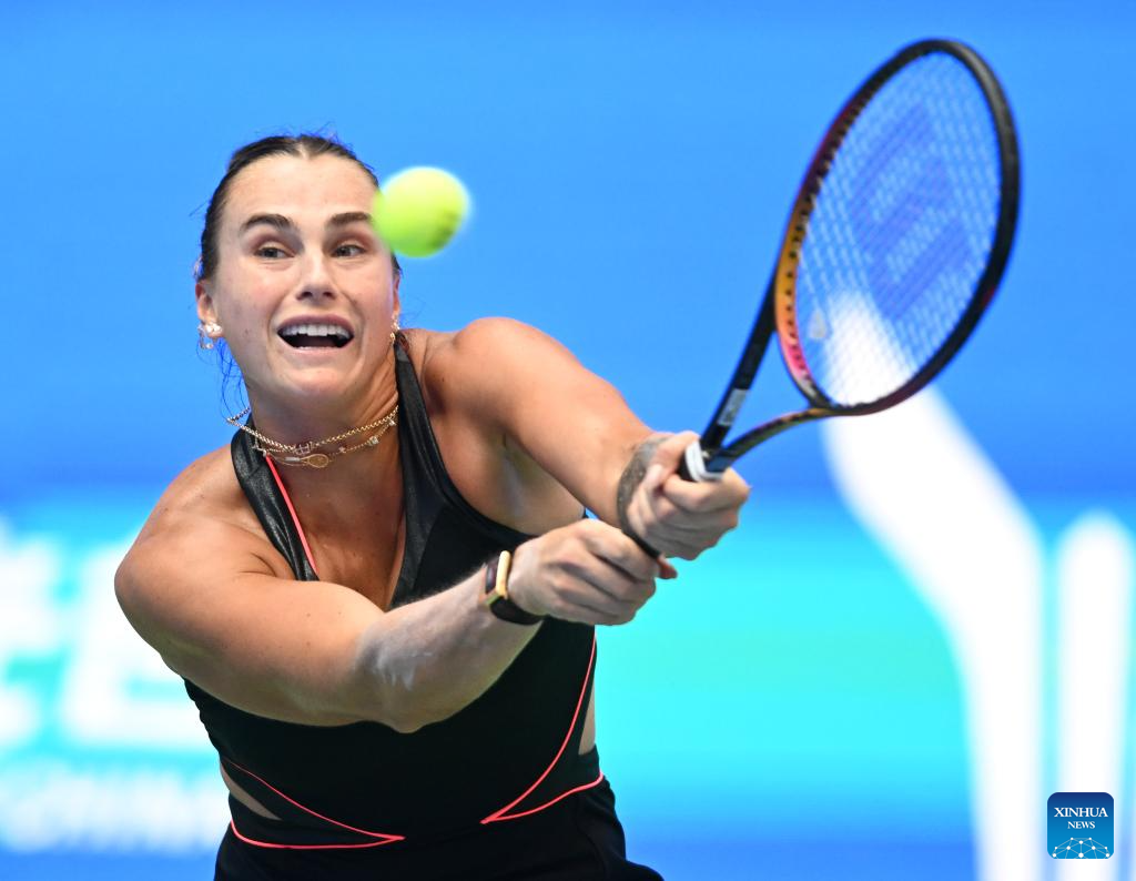 Aryna Sabalenka of Belarus hits a return during the women's singles round of 32 match against Rebecca Sramkova of Slovakia at the 2025 Wuhan Open tennis tournament in Wuhan, central China's Hubei Province, Oct. 8, 2025. (Xinhua/Cheng Min)