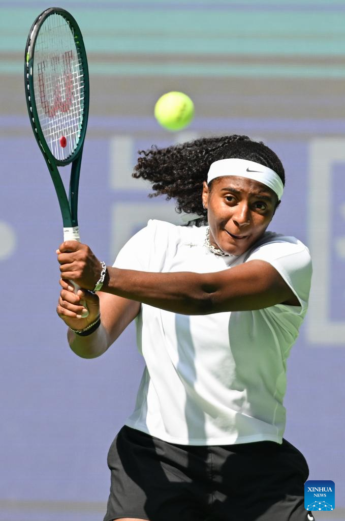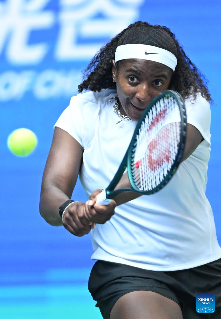 Hailey Baptiste of the United States returns a hit during the women's singles round of 32 match against Jessica Pegula of the United States at the 2025 Wuhan Open tennis tournament in Wuhan, central China's Hubei Province, Oct. 8, 2025. (Xinhua/Cheng Min)