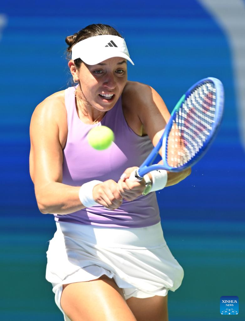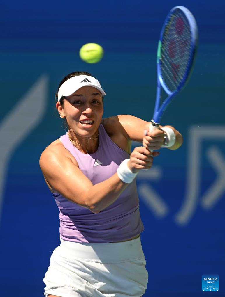 Jessica Pegula of the United States returns a hit during the women's singles round of 32 match against Hailey Baptiste of the United States at the 2025 Wuhan Open tennis tournament in Wuhan, central China's Hubei Province, Oct. 8, 2025. (Xinhua/Cheng Min)