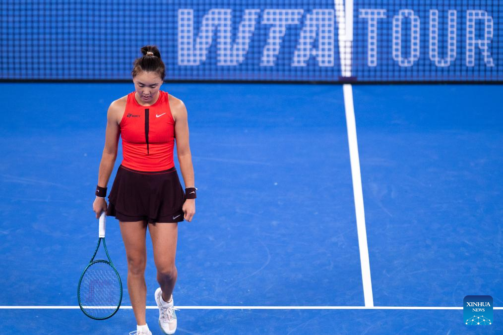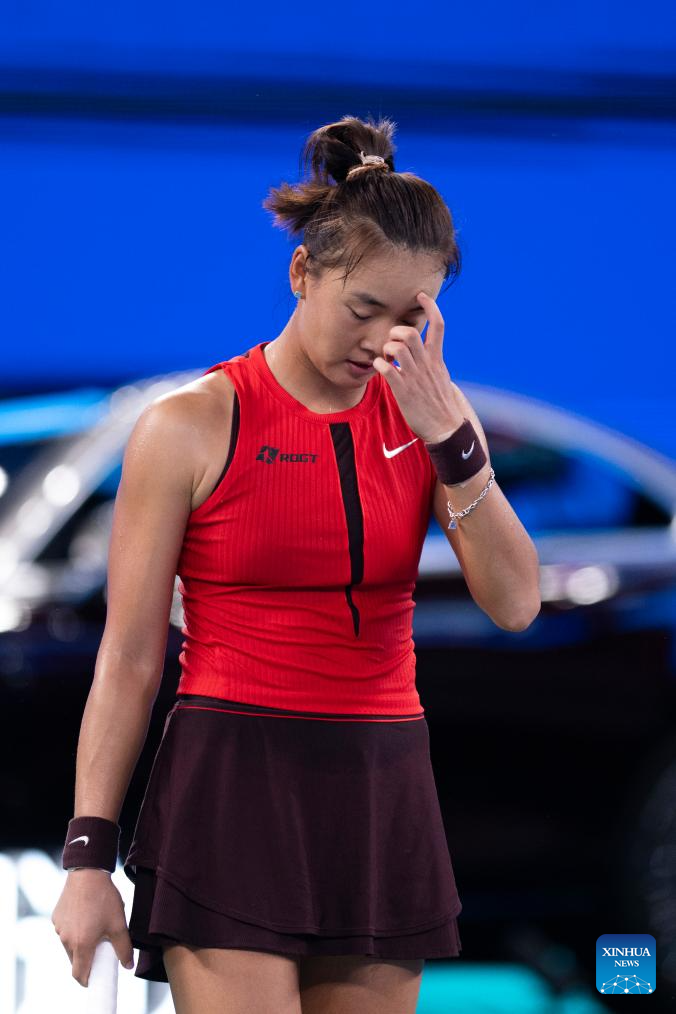 Yuan Yue of China reacts during the women's singles round of 32 match against Jasmine Paolini of Italy at the 2025 Wuhan Open tennis tournament in Wuhan, central China's Hubei Province, Oct. 8, 2025. (Xinhua/Wu Zhizun)