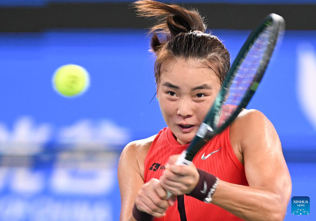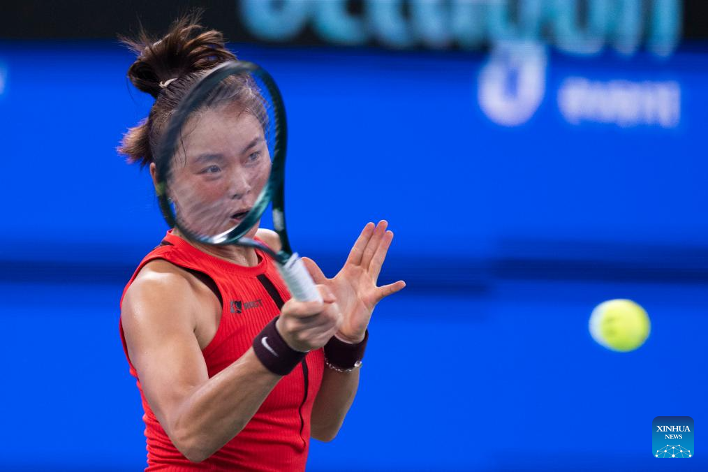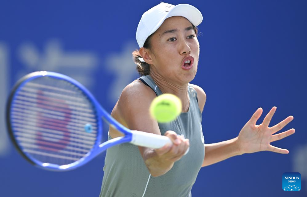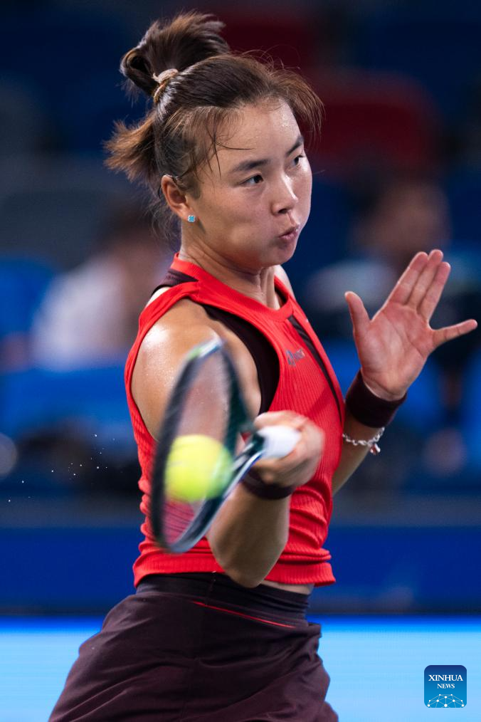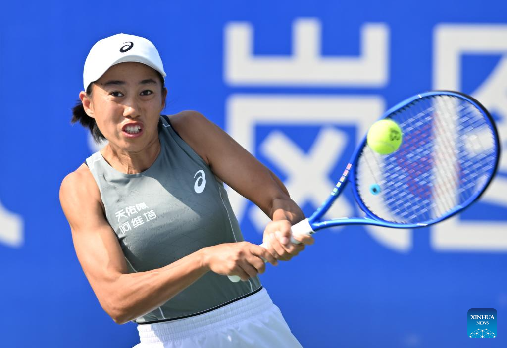 Zhang Shuai of China returns a hit during the women's singles round of 32 match against Sorana Cirstea of Romania at the 2025 Wuhan Open tennis tournament in Wuhan, central China's Hubei Province, Oct. 8, 2025. (Xinhua/Cheng Min)