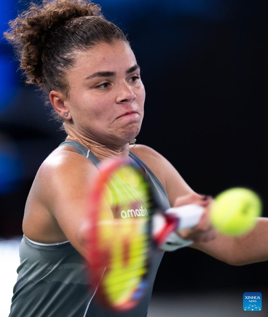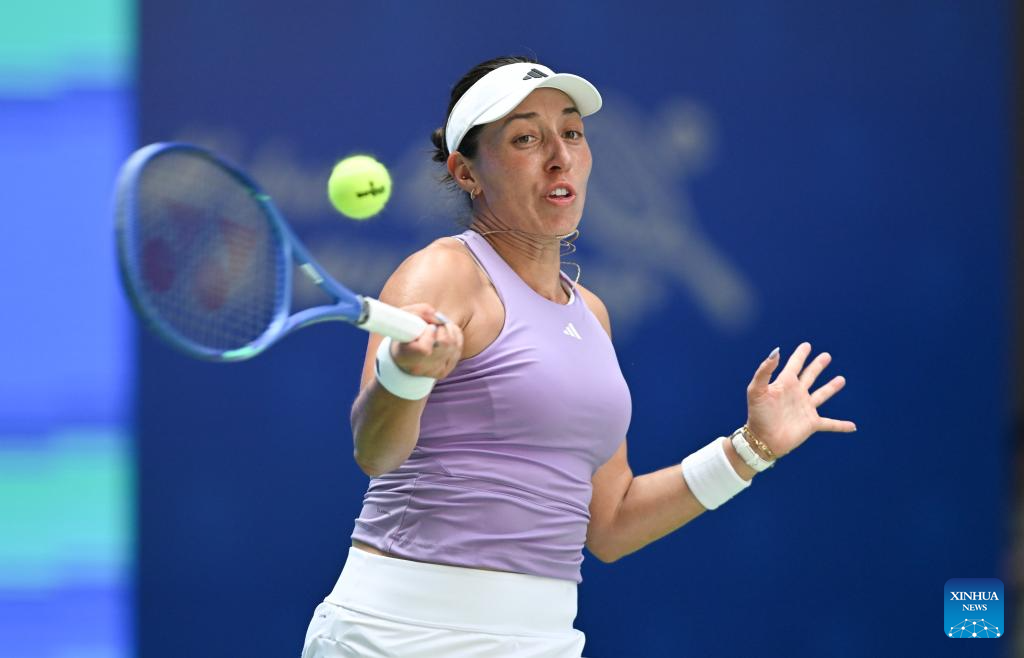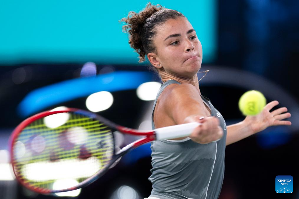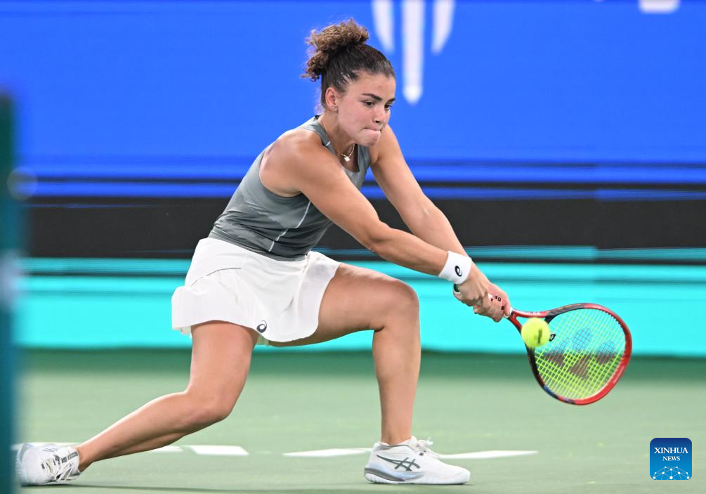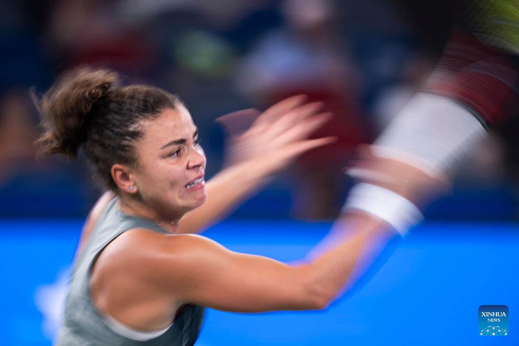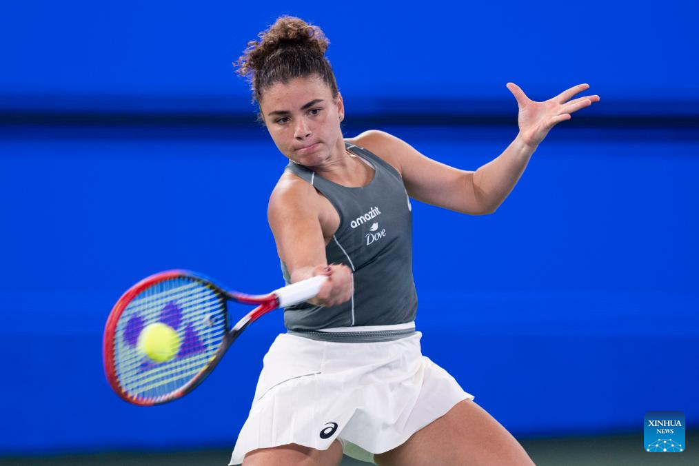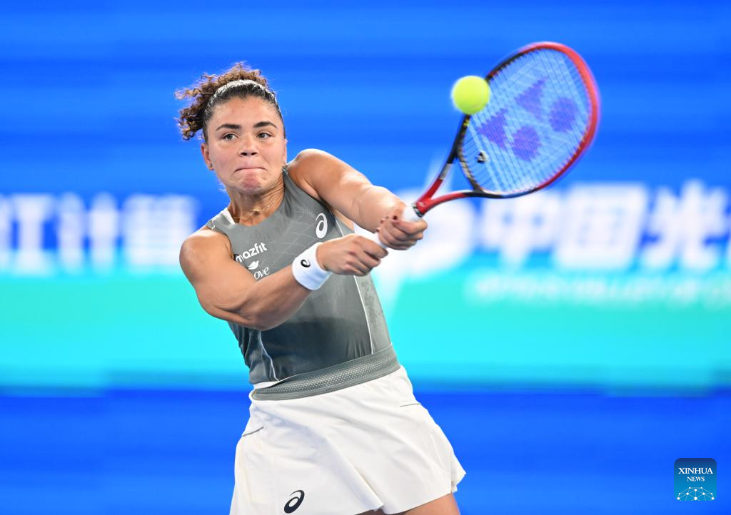 Jasmine Paolini of Italy hits a return during the women's singles round of 32 match against Yuan Yue of China at the 2025 Wuhan Open tennis tournament in Wuhan, central China's Hubei Province, Oct. 8, 2025. (Xinhua/Cheng Min)