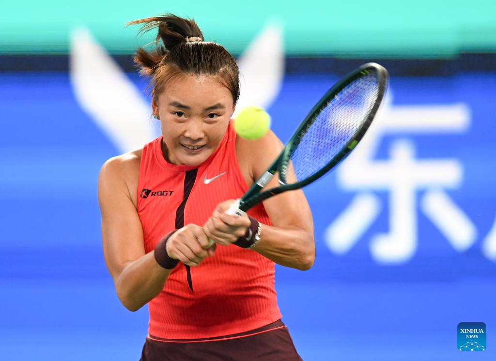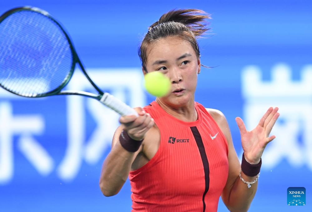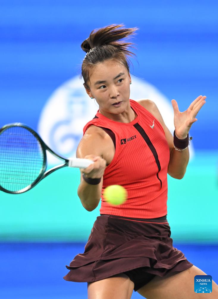 Yuan Yue of China hits a return during the women's singles round of 32 match against Jasmine Paolini of Italy at the 2025 Wuhan Open tennis tournament in Wuhan, central China's Hubei Province, Oct. 8, 2025. (Xinhua/Wu Zhizun)