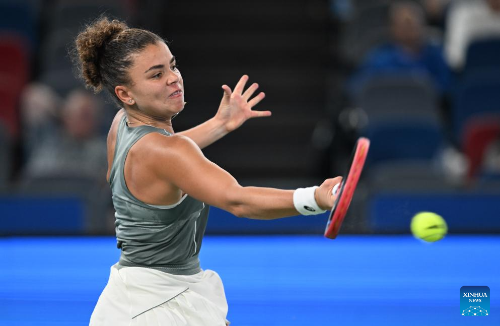 Jasmine Paolini of Italy hits a return during the women's singles round of 32 match against Yuan Yue of China at the 2025 Wuhan Open tennis tournament in Wuhan, central China's Hubei Province, Oct. 8, 2025. (Xinhua/Wu Zhizun)
