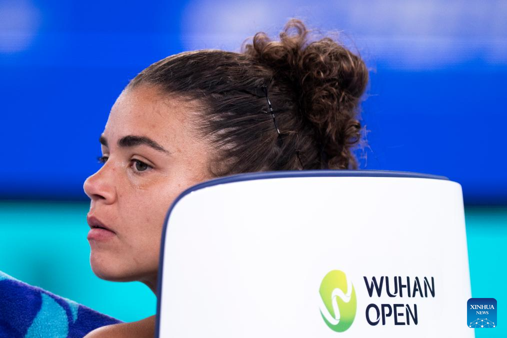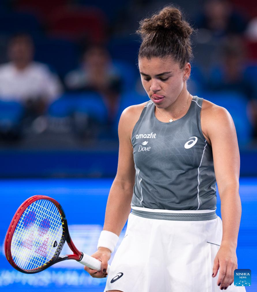 Jasmine Paolini of Italy reacts during the women's singles round of 32 match against Yuan Yue of China at the 2025 Wuhan Open tennis tournament in Wuhan, central China's Hubei Province, Oct. 8, 2025. (Xinhua/Wu Zhizun)