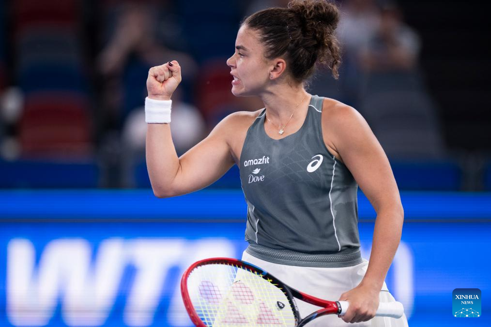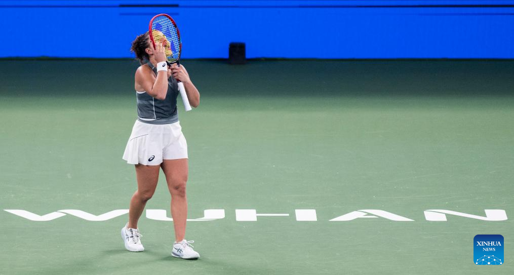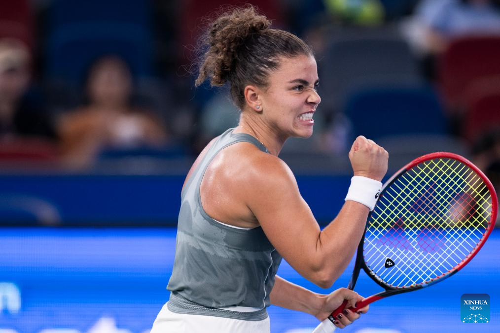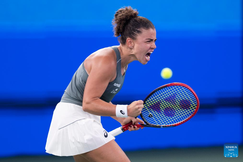 Jasmine Paolini of Italy celebrates winning the women's singles round of 32 match against Yuan Yue of China at the 2025 Wuhan Open tennis tournament in Wuhan, central China's Hubei Province, Oct. 8, 2025. (Xinhua/Wu Zhizun)