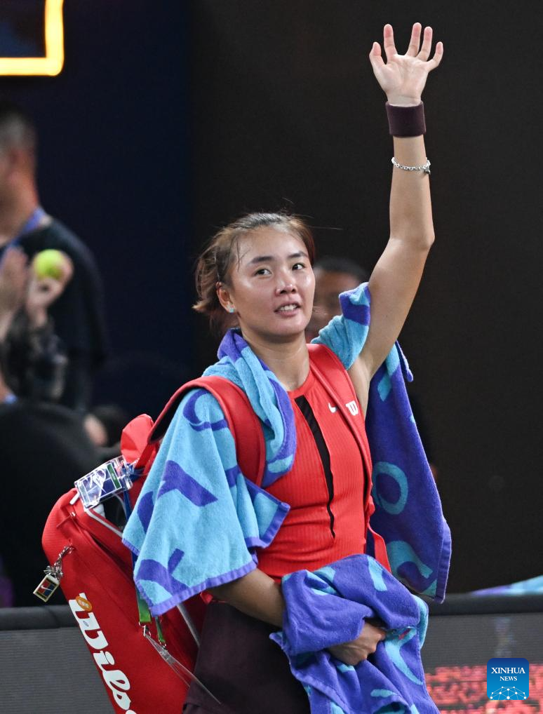 Yuan Yue of China waves to the spectators after the women's singles round of 32 match against Jasmine Paolini of Italy at the 2025 Wuhan Open tennis tournament in Wuhan, central China's Hubei Province, Oct. 8, 2025. (Xinhua/Cheng Min)