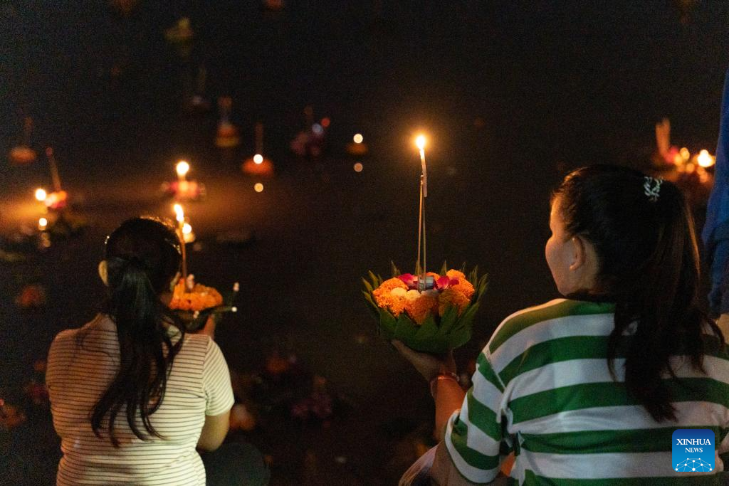 People put lighted boats made of banana leaves on the Mekong River in Vientiane, Laos, Oct. 7, 2025. (Photo by Kaikeo Saiyasane/Xinhua)