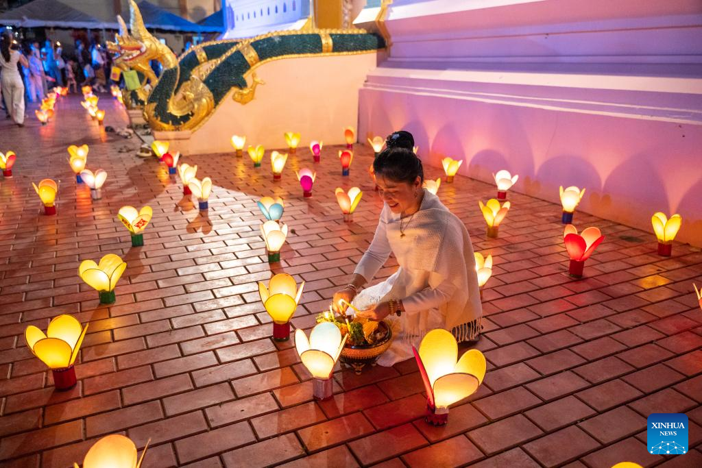 A woman lights a lantern in a temple in Vientiane, Laos, Oct. 7, 2025. (Photo by Kaikeo Saiyasane/Xinhua)