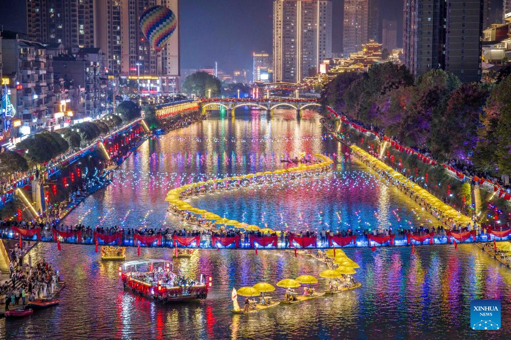 A drone photo taken on Oct. 6, 2025 shows tourists admiring the night scenery in Xuan'en County, central China's Hubei Province. Tourists across the country show no sign of fading enthusiasm as the National Day and Mid-Autumn Festival holiday draws to a close. (Photo by Wang Fajun/Xinhua)