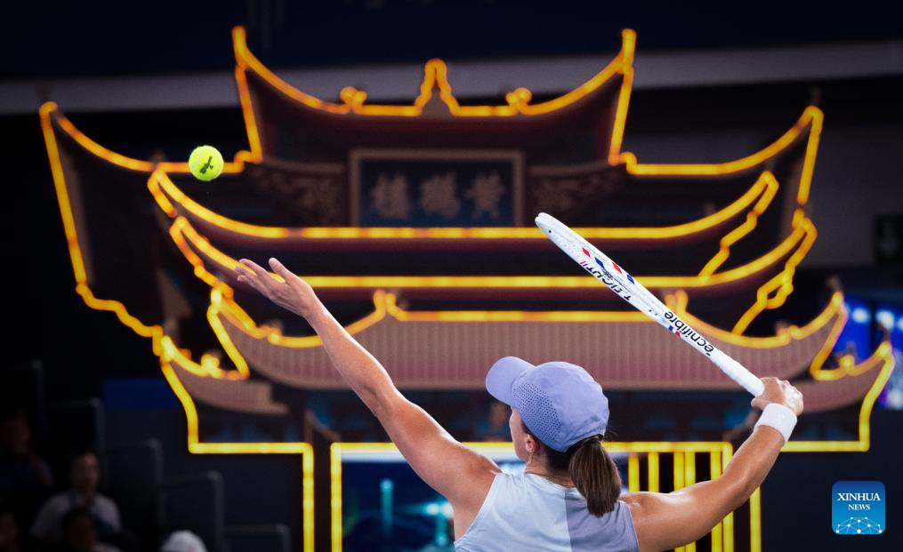 Iga Swiatek of Poland serves during the women's singles round of 32 match against Marie Bouzkova of the Czech Republic at the 2025 Wuhan Open tennis tournament in Wuhan, central China's Hubei Province, Oct. 7, 2025. (Xinhua/Xiao Yijiu)