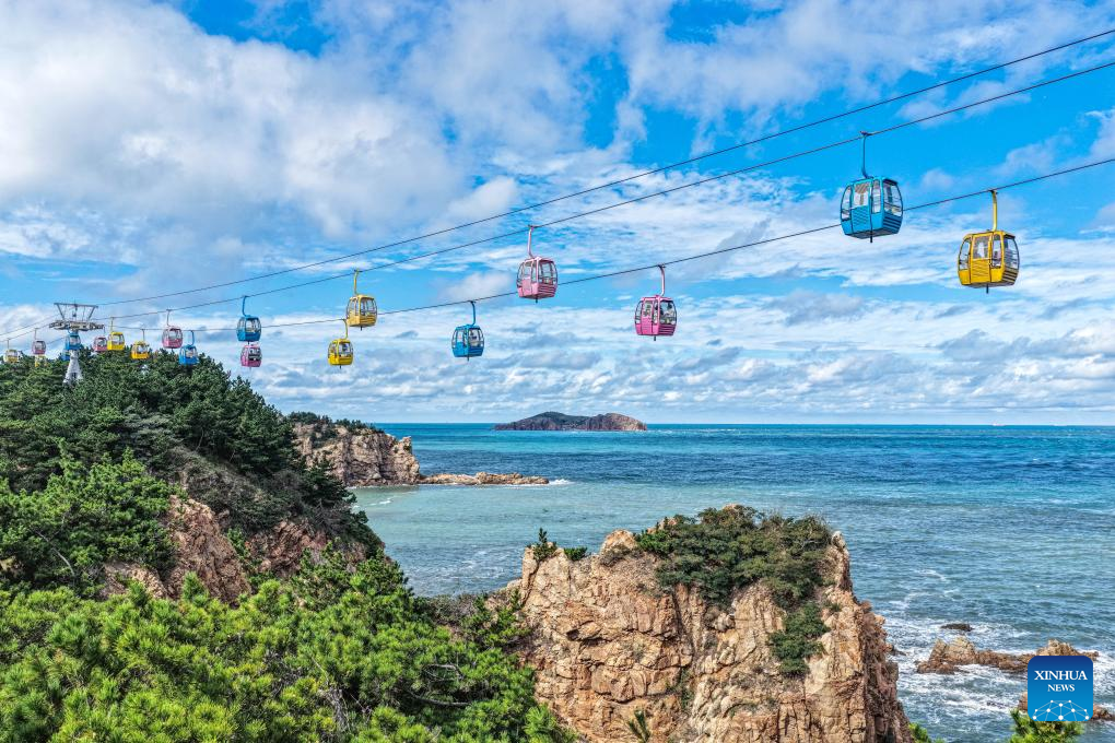 A drone photo taken on Oct. 7, 2025 shows tourists taking sightseeing cable cars at a scenic spot in Rongcheng, east China's Shandong Province. Tourists across the country show no sign of fading enthusiasm as the National Day and Mid-Autumn Festival holiday draws to a close. (Photo by Li Xinjun/Xinhua)